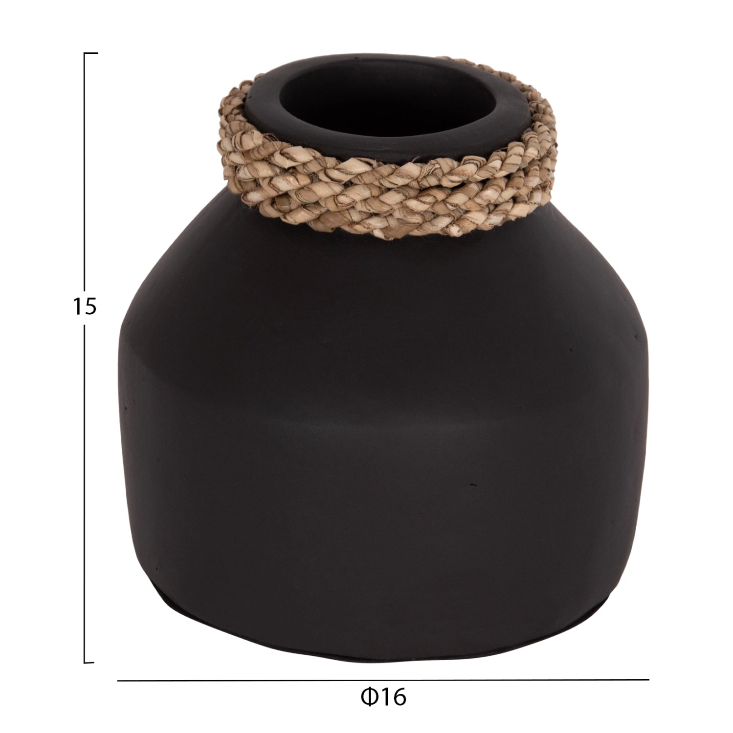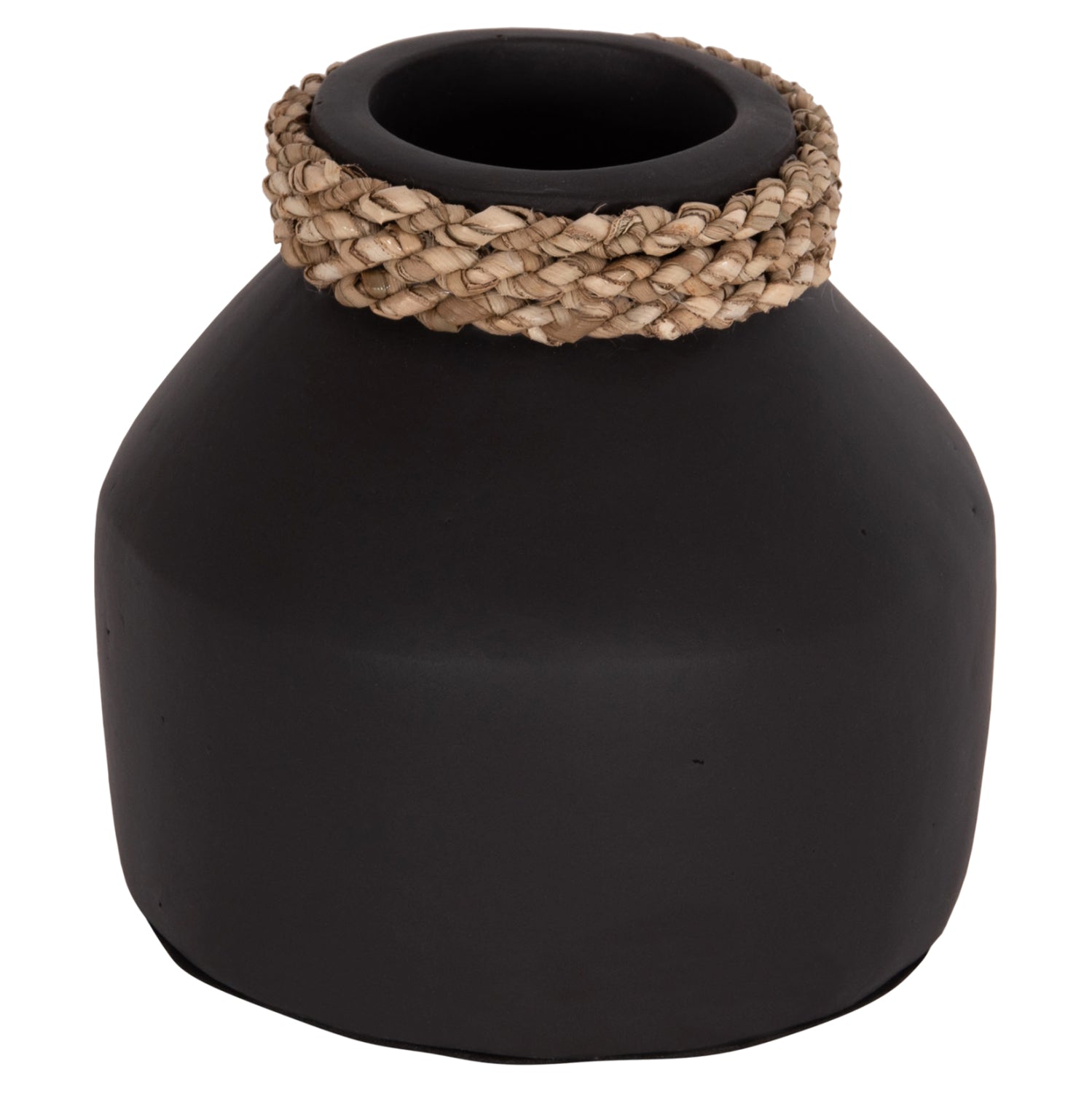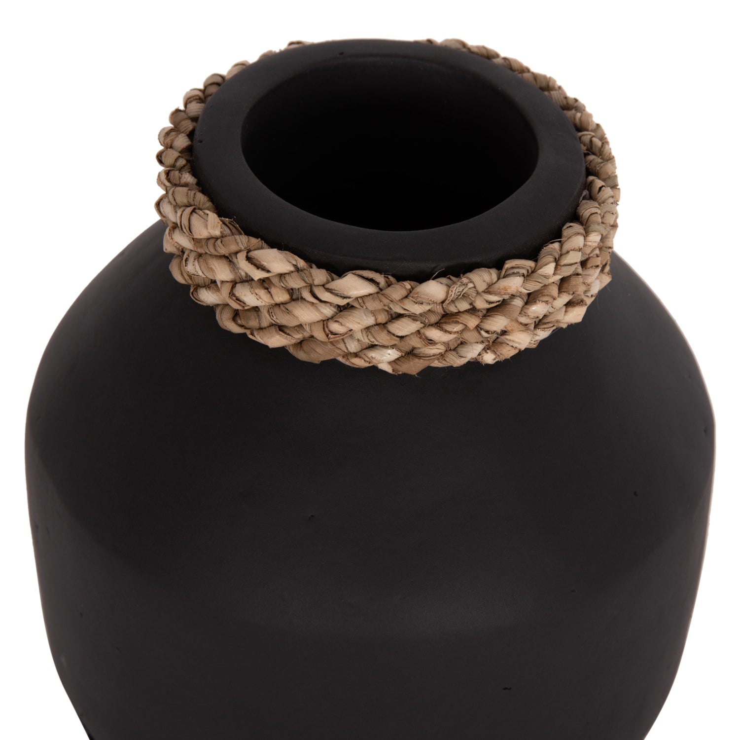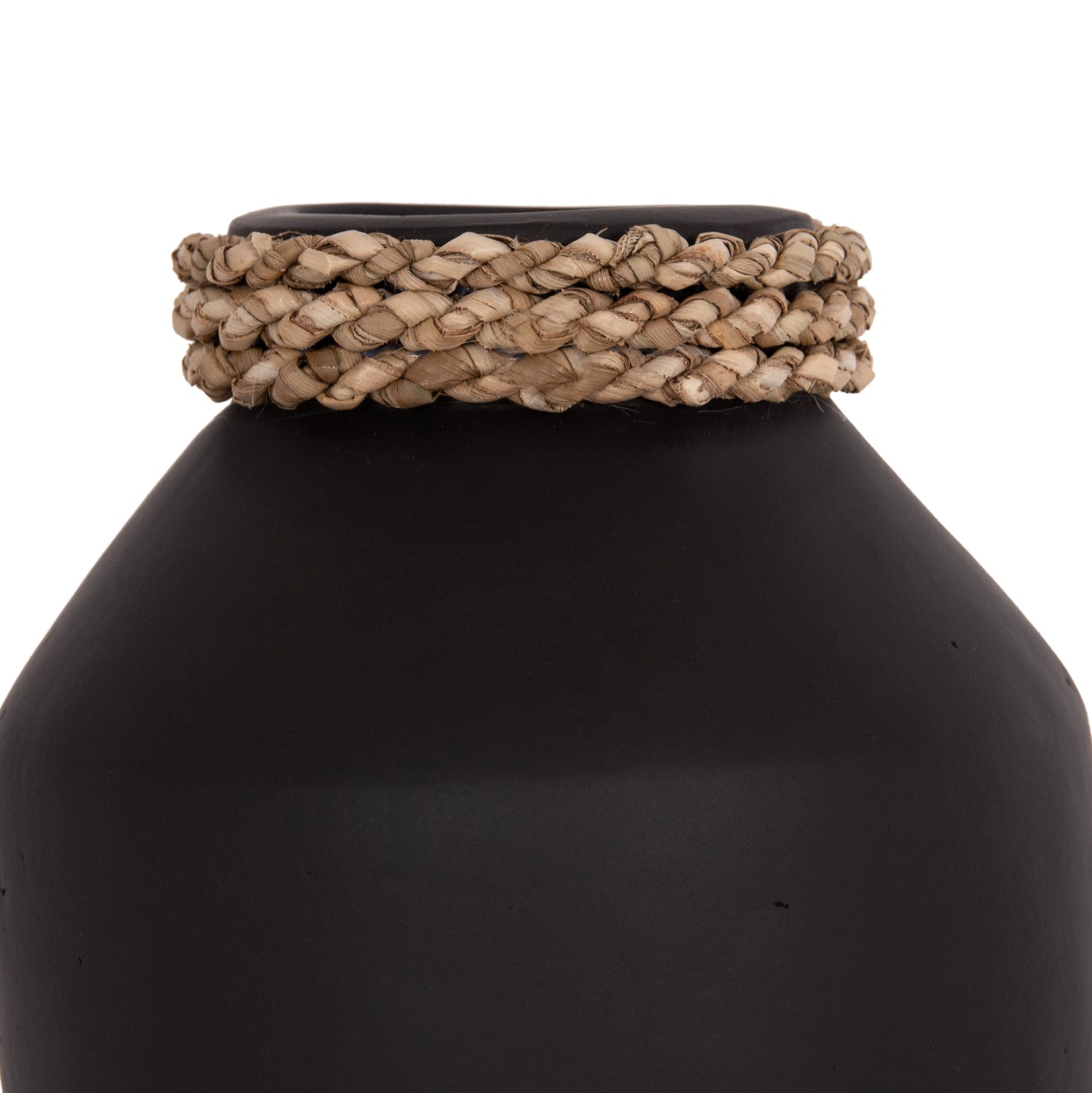 Arlo Vase is a handmade decorative terracotta vase in matte black with natural seagrass detail around the neck. A stylish accent for modern homes, hotels, or offices.