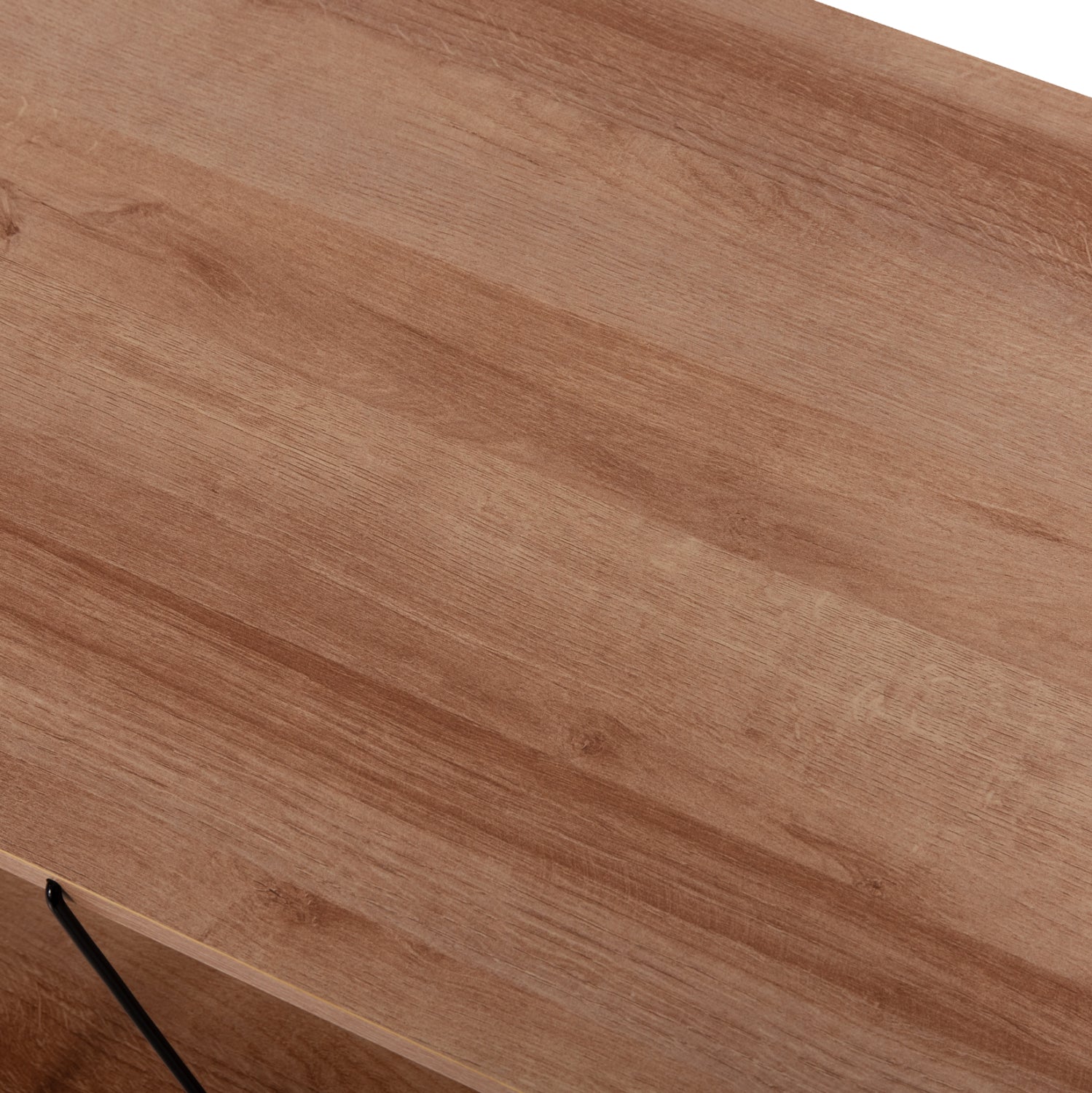 The Aton set brings modern industrial style to your living room with a matching TV stand and coffee table. Crafted from durable melamine in natural oak color with sleek black metal rods, it combines practicality and design.