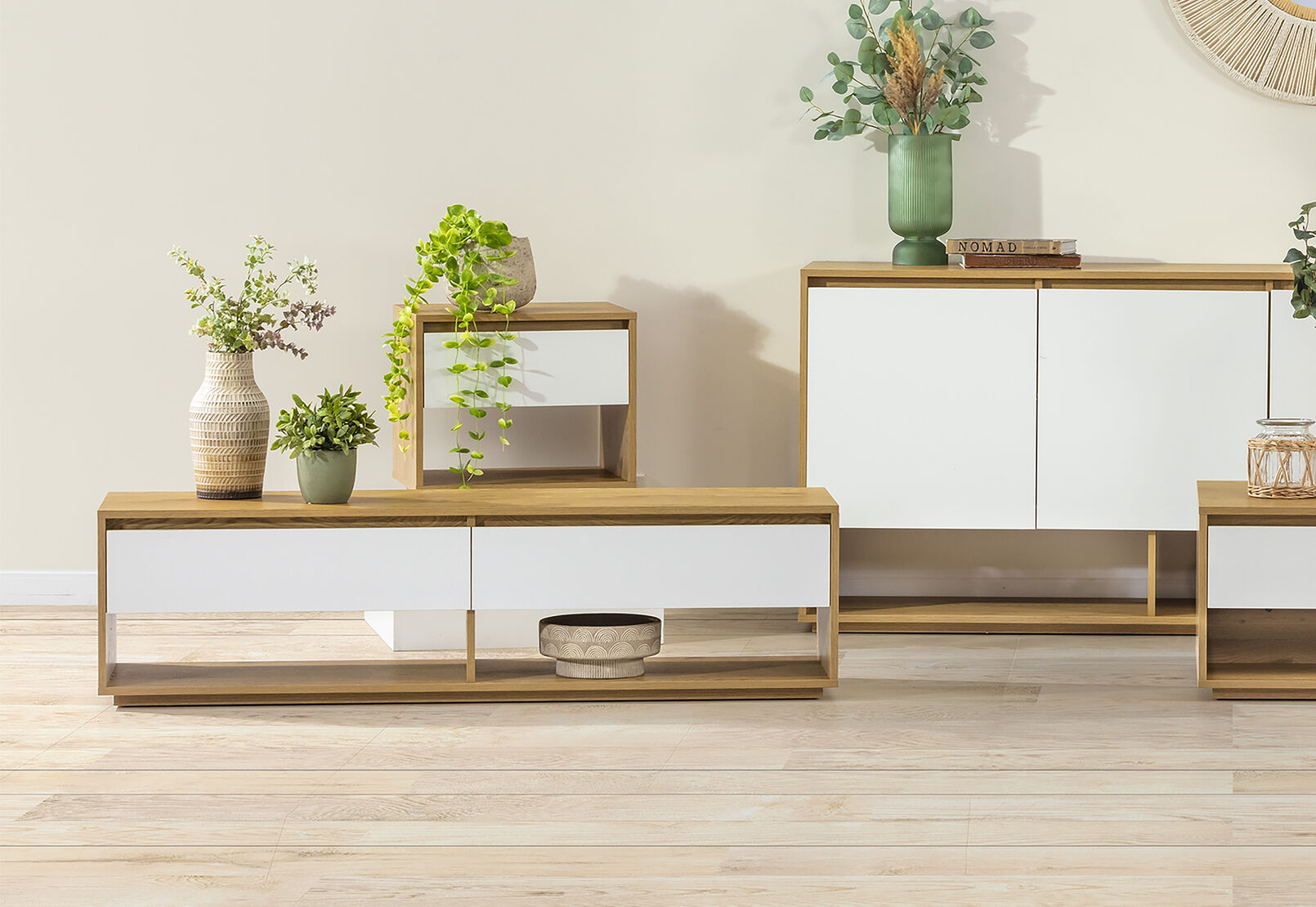 Elevate your living space with this stylish and functional coffee table. Crafted from premium particle board (PB) with a sleek oak melamine finish, it offers a warm and natural look that complements any decor. The 4 spacious drawers, featuring elegant white melamine fronts, provide ample storage to keep your space tidy and clutter-free.