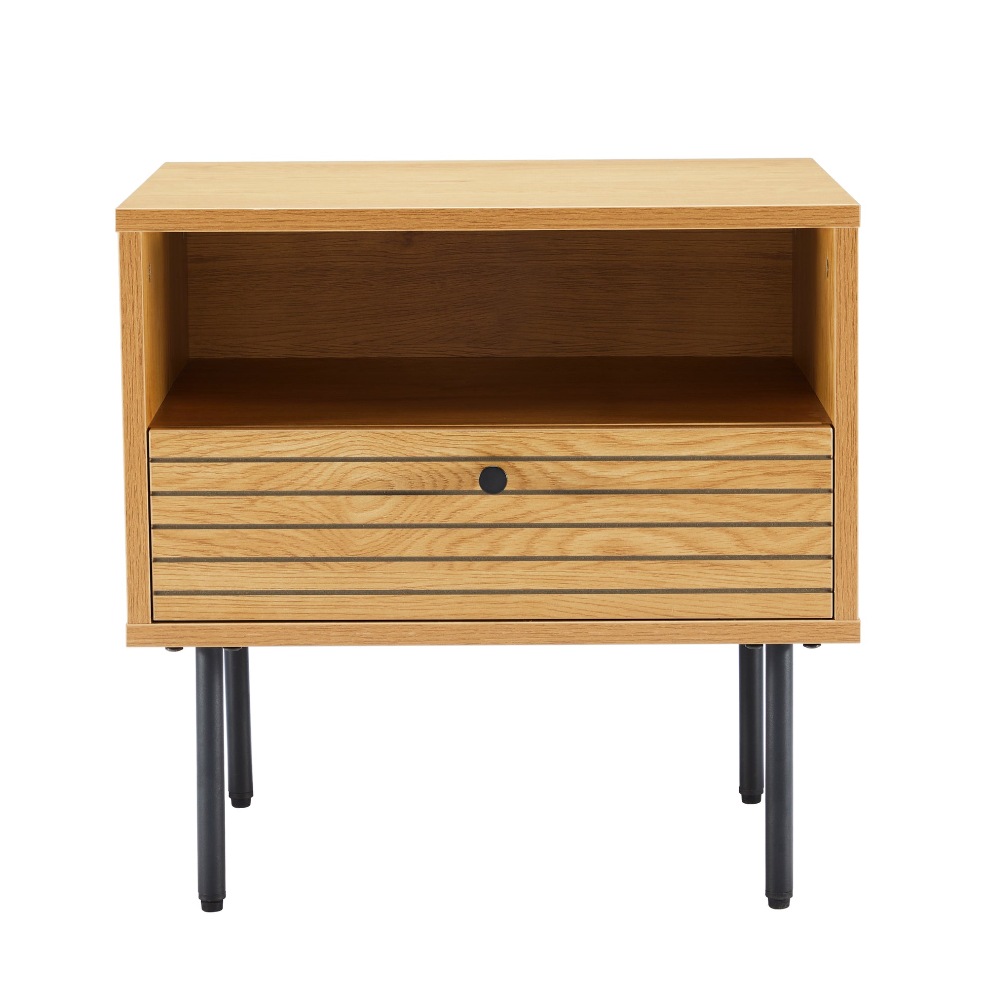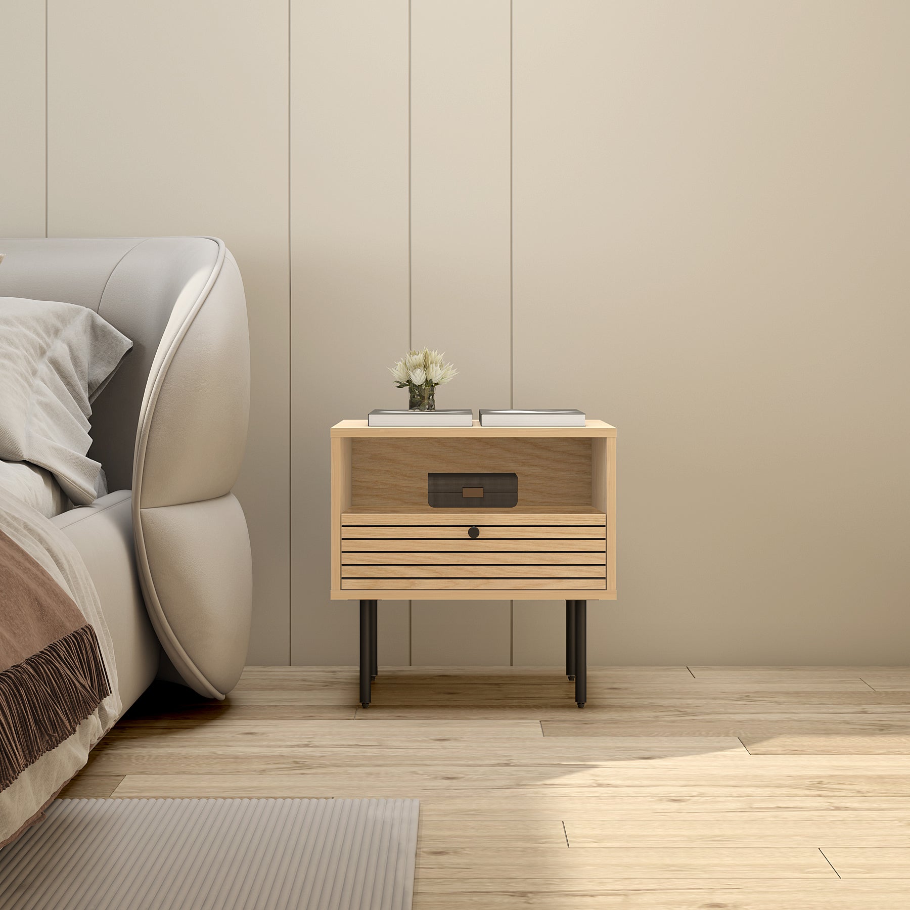 The Elara Nightstand is where minimalist design meets modern functionality. Crafted with precision, it features a PB cabinet with a sleek oak melamine finish that adds warmth and elegance to your bedroom. The black MDF door and drawer front, accented with parallel oak melamine lines, create a contemporary aesthetic that effortlessly complements any interior.