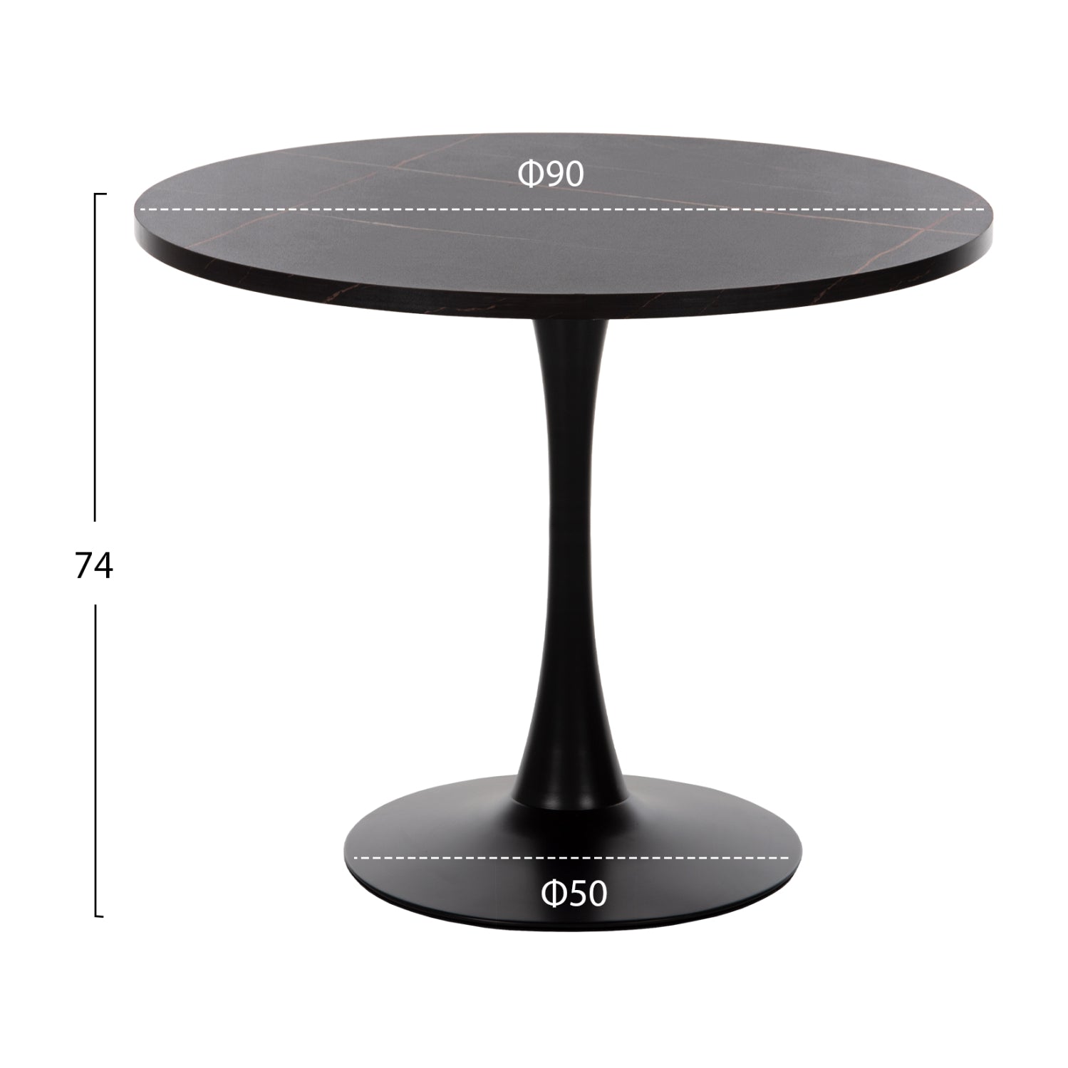 The EVO dining table features a sleek melamine with black marble look top supported by a sturdy black metal column and round base. Its minimalist design fits perfectly in modern homes, cafés, or restaurants.