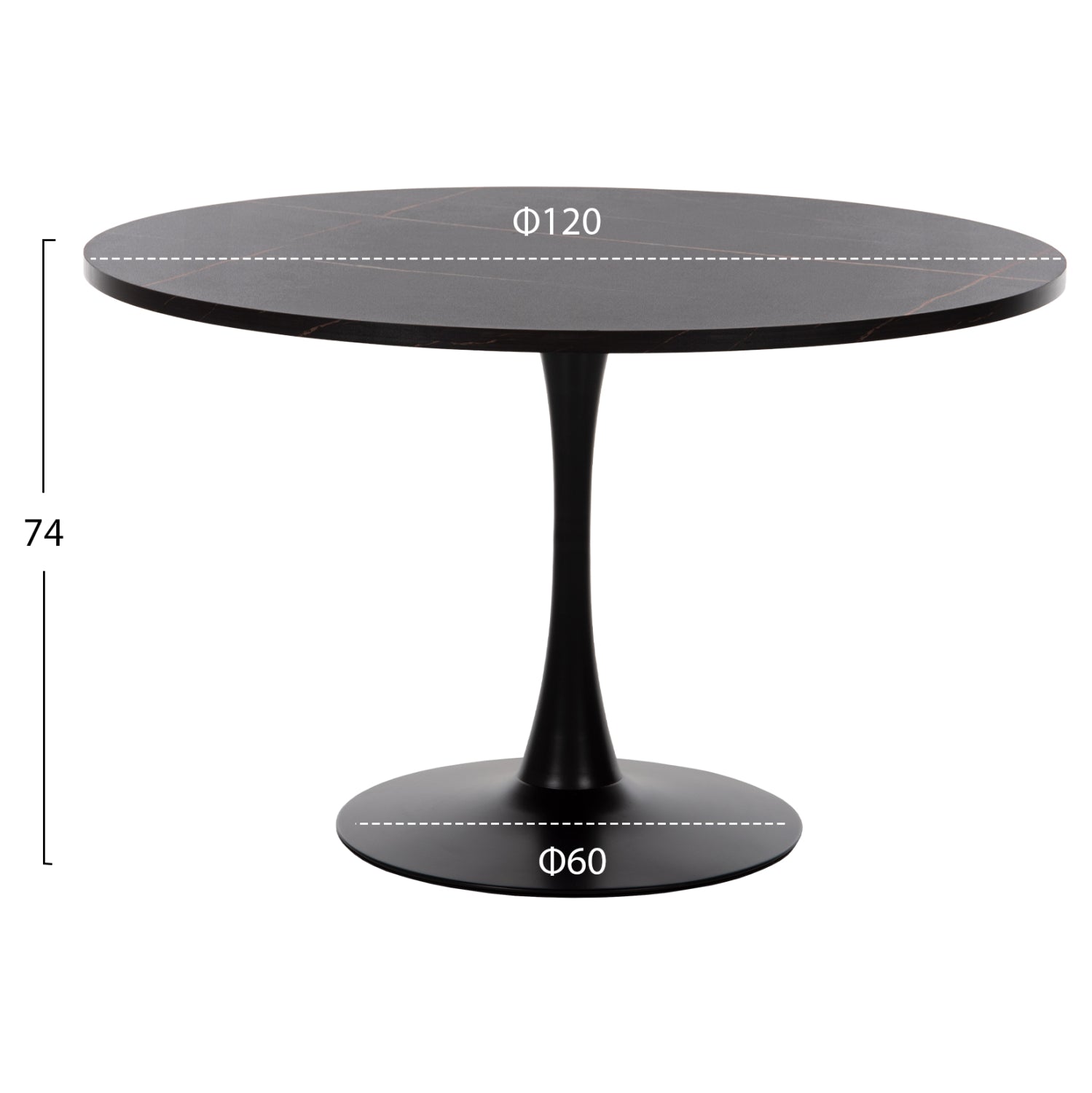 The EVO dining table features a sleek melamine with black marble look top supported by a sturdy black metal column and round base. Its minimalist design fits perfectly in modern homes, cafés, or restaurants.
