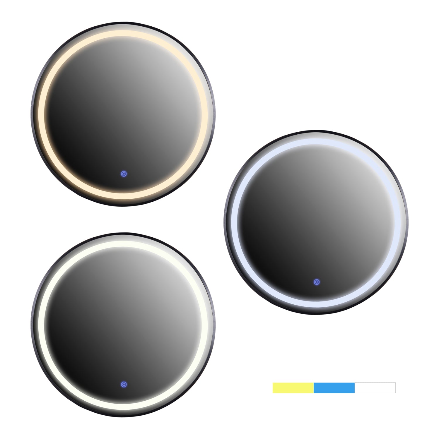 Glow Mirror is a modern round LED wall mirror with a sleek black aluminum frame. Its built-in touch sensor lets you switch between three light modes — warm, cool, and natural white. Perfect for bathrooms or bedrooms, adding both style and functionality.
