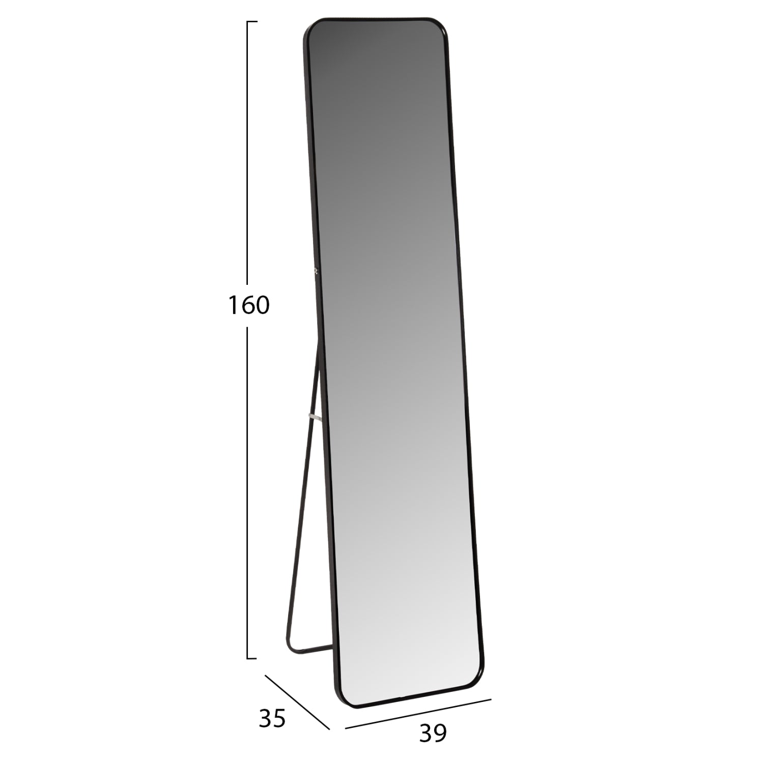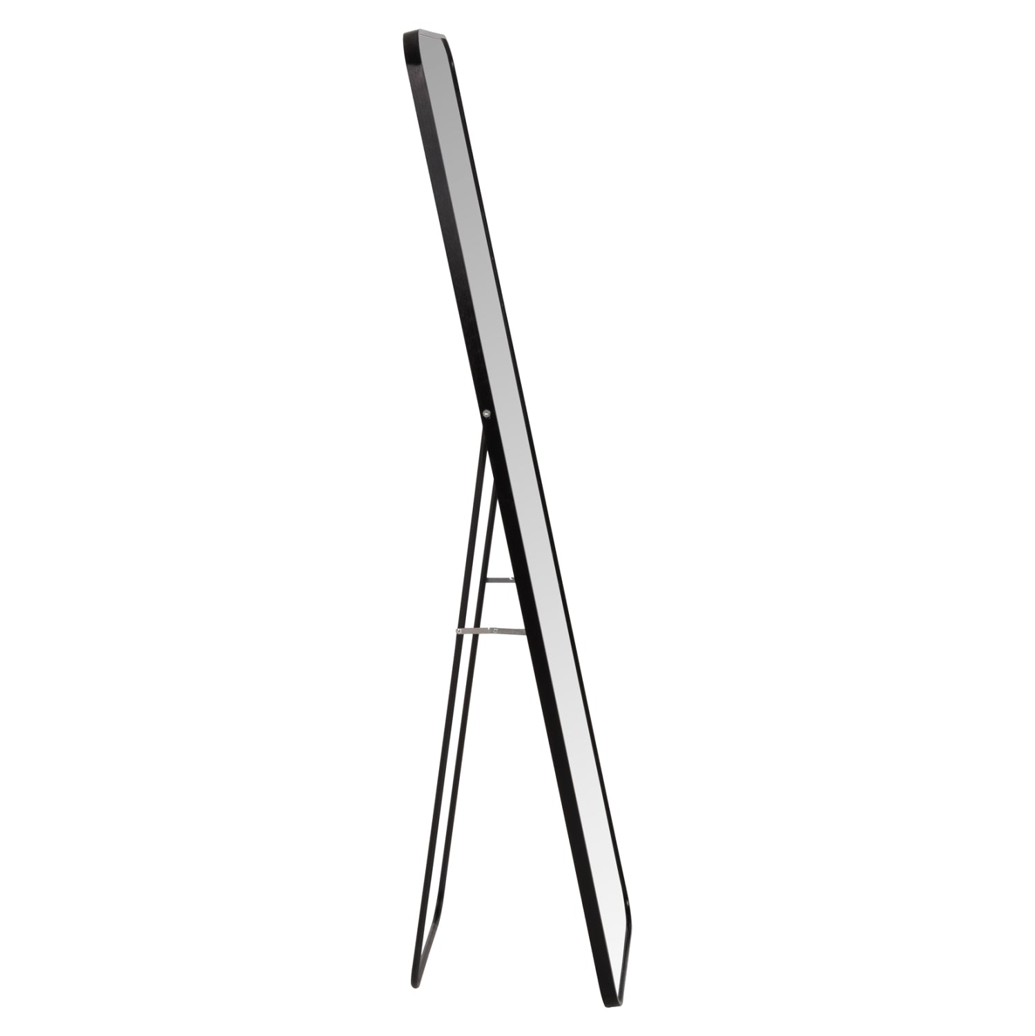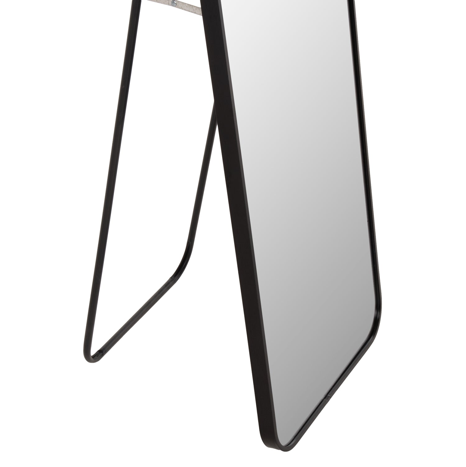 The Loop floor mirror features a sleek black aluminum frame with soft rounded corners, blending effortlessly with both modern and classic interiors. Lightweight, durable, and easy to position thanks to its collapsible stand — a stylish and functional addition to any room.