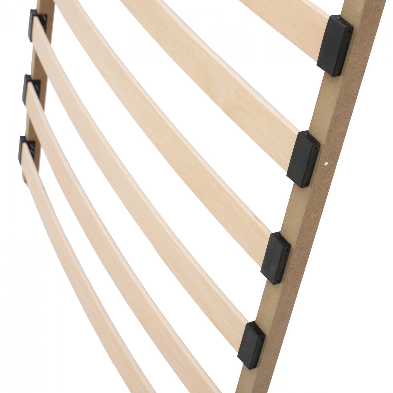 Bed frame with anatomical wooden slats for supporting a bed mattress.