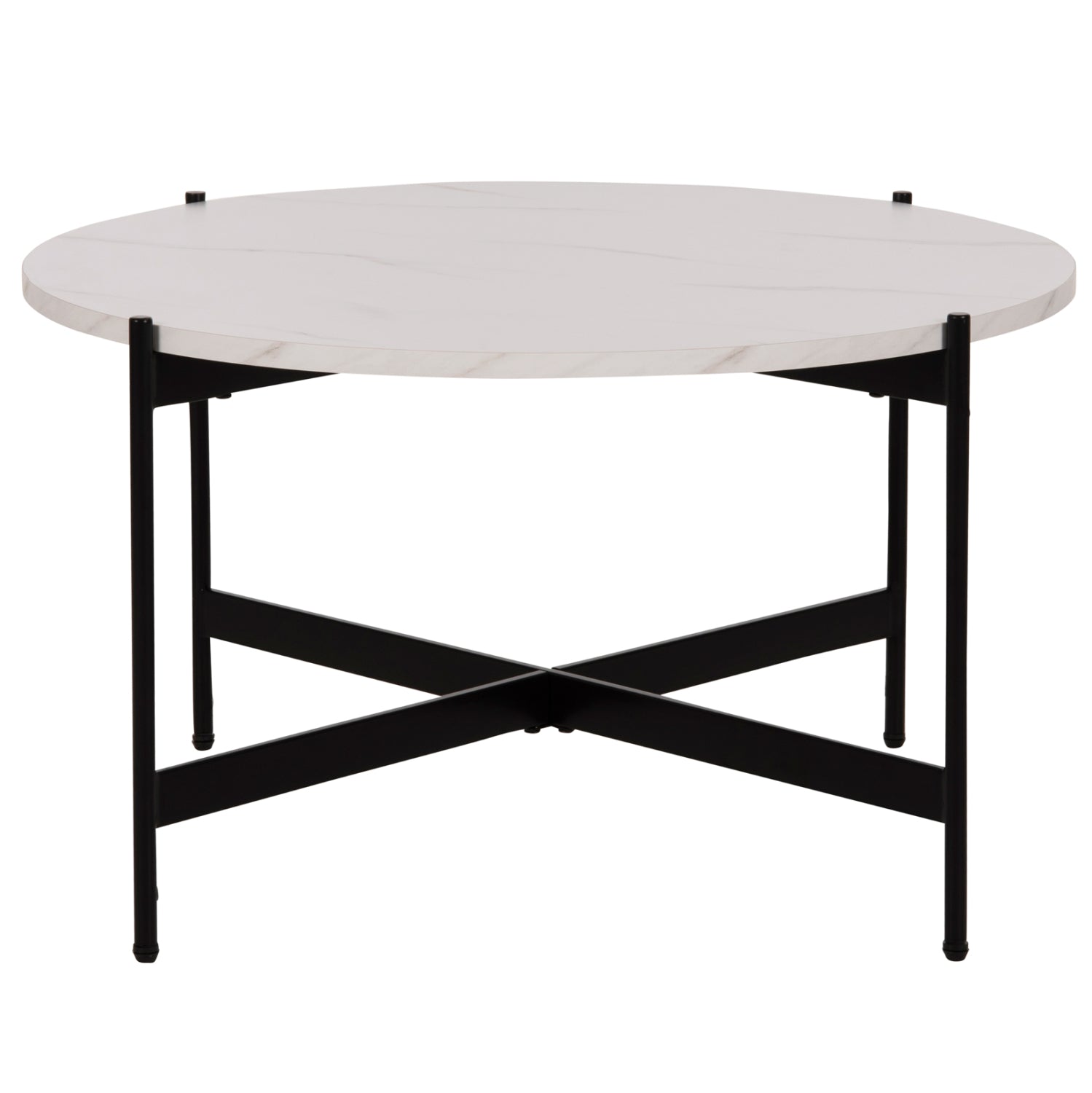 NERO modern round coffee table combines elegance and function with its White marble-effect MDF top resting on a sturdy black cross-shaped metal base. Ideal for living rooms, lounges, or offices.