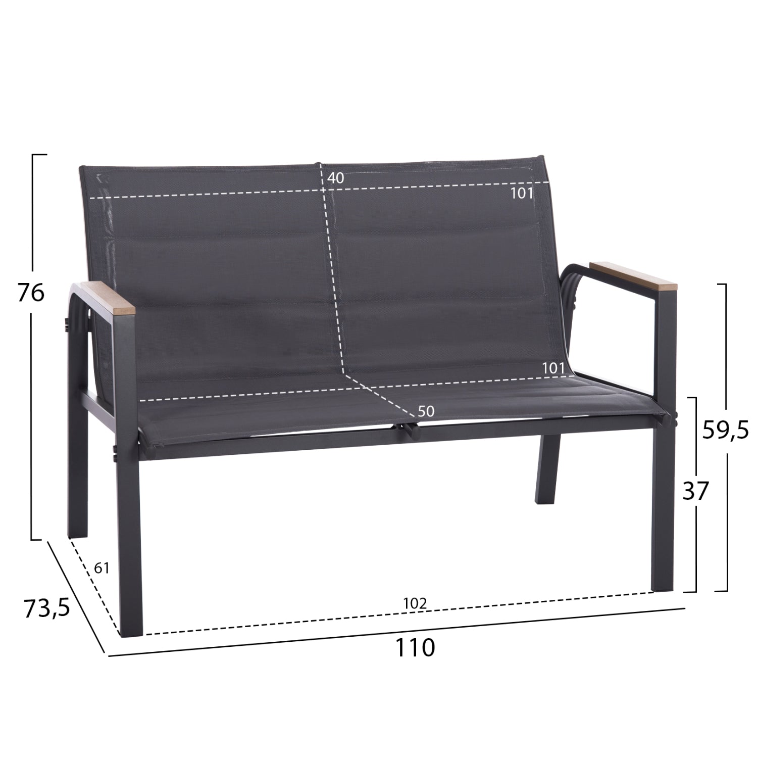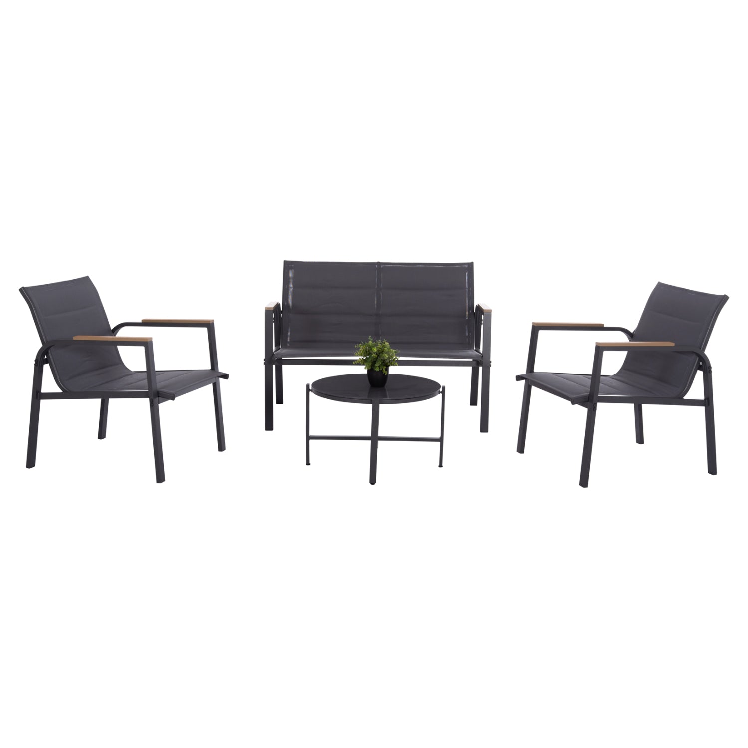 The Nesa lounge set includes a 2-seater sofa, two comfortable armchairs, and a round coffee table—designed for style, comfort, and durability. The sofa and chairs feature a strong aluminum frame with premium textilene fabric and a soft foam layer for added comfort. The coffee table comes with a tempered glass top, offering strength and a modern look.
