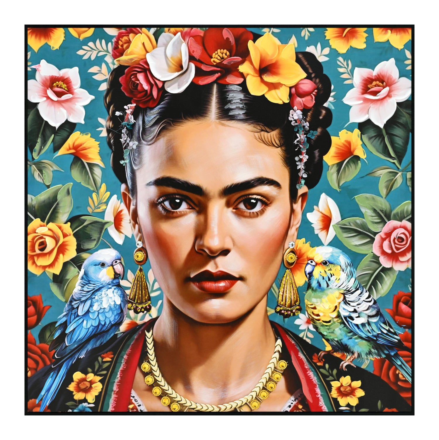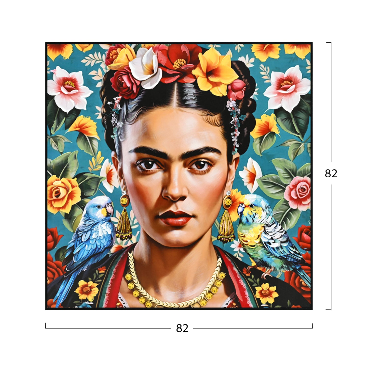 Add vibrancy and charm to your space with this hand-painted wall art depicting a woman with two parrots. Crafted with acrylic colors on printed canvas and framed in black polystyrene, it’s a stunning focal point for any modern interior.